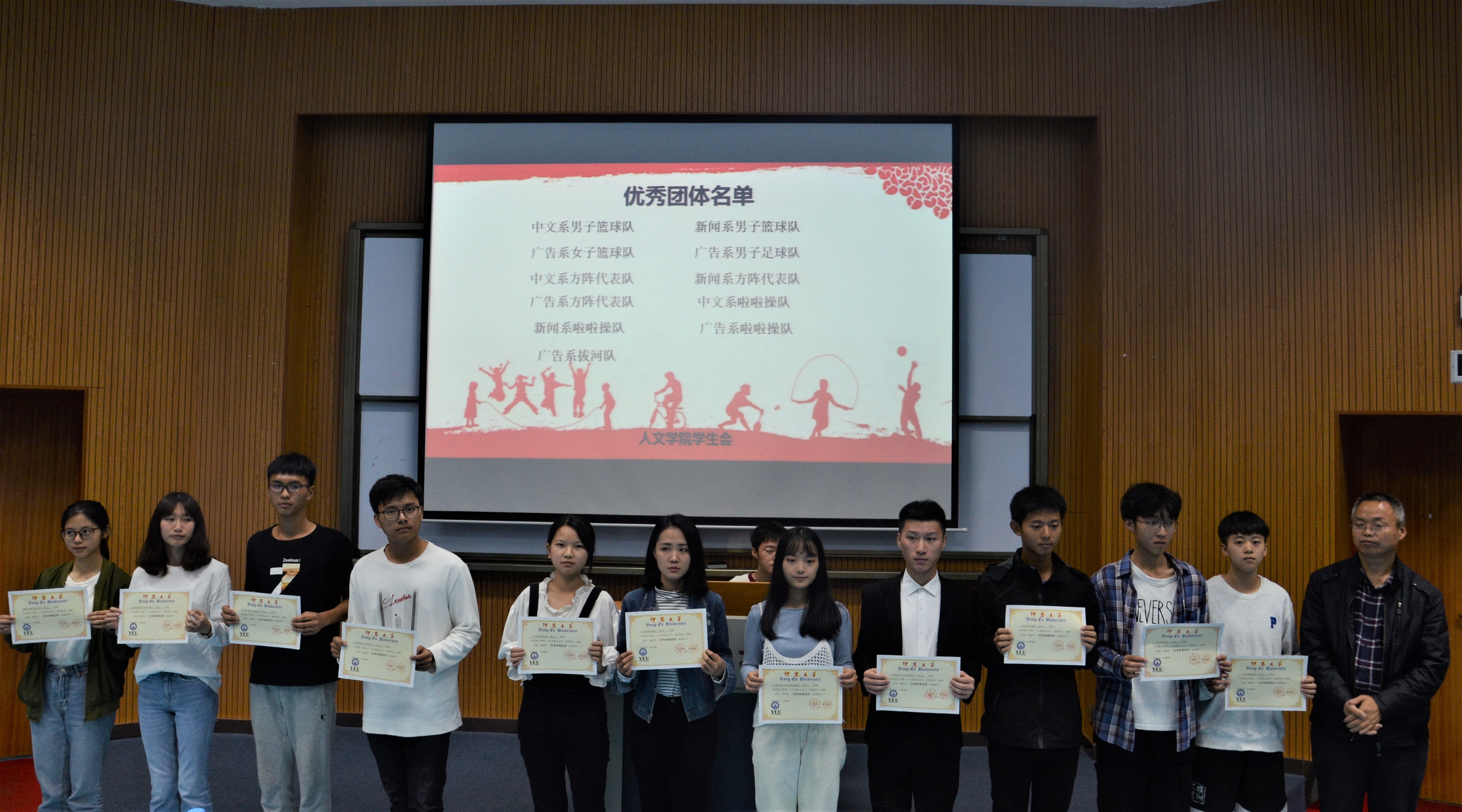 活动现场 在场老师同学观看了运动会的回顾视频,重温人文学子在赛场上的风采。随后,指导老师李少聪对beat365取得的优异成绩进行简要概括。在本次校运会中,林晴、黄宝钰等10人荣获“优秀运动员”称号;陈鸿腾、繆芸菲等10人获得“先进个人”称号;范乾煜、吴健欣、王鹏、范轩铭、林俊敏、黄婧茹等人荣获“仰恩大学道德体育风尚奖”;中文系篮球队、新闻系篮球队、广告女子篮球队等11支队伍荣获“运动会优秀参赛团体”称号;梁宇韬、庄佳琪、陈乐、杨鑫等荣获本次校运会“先进工作者”称号;吴佳丽、闫梦奇等六位同学获得学院啦啦操教练聘书。