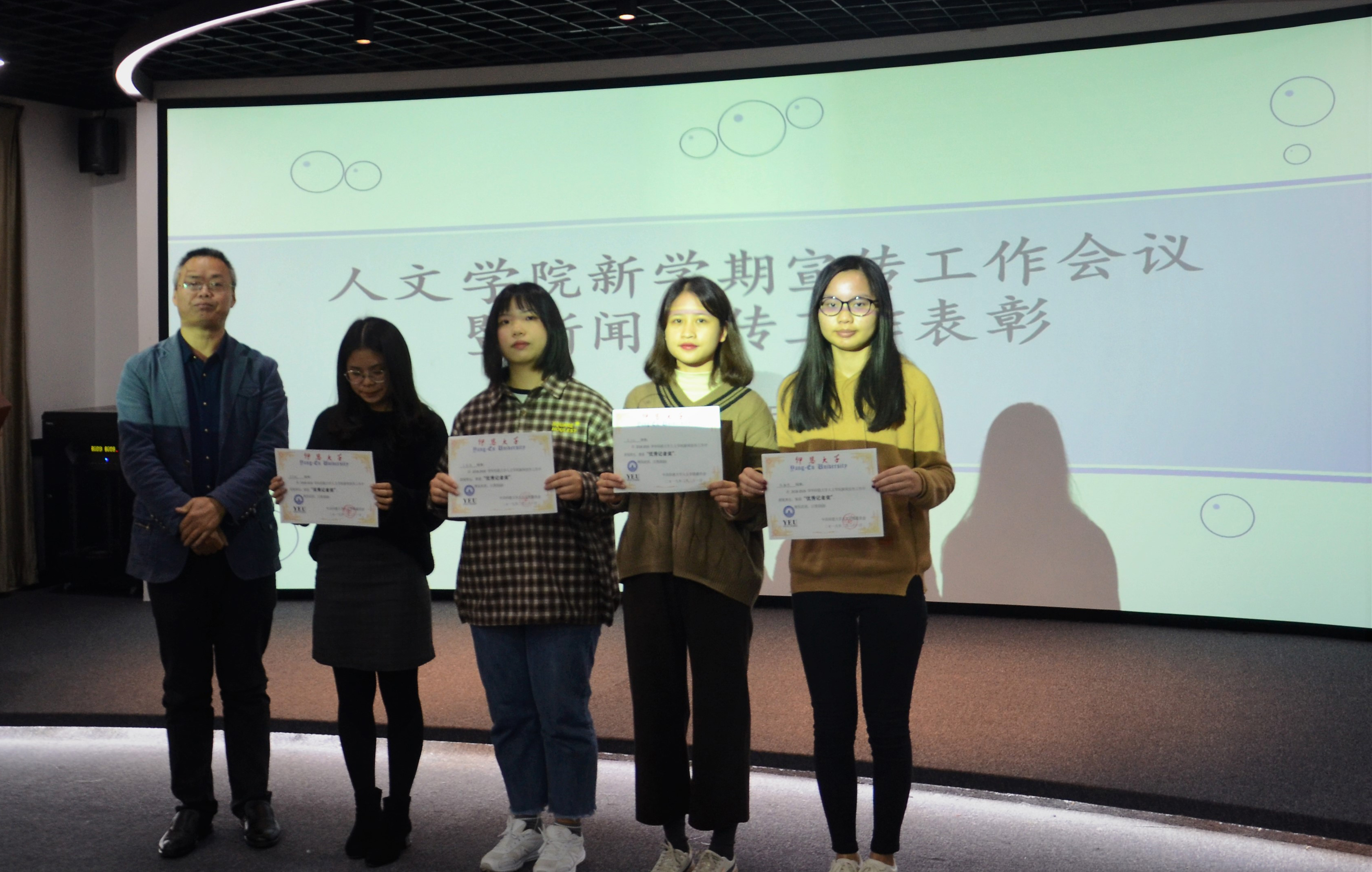会议现场 在本次新闻宣传工作表彰中,谢梦、魏梦婷荣获特别贡献奖;马贤颖、吴艳梅、林静琦、尤小红荣获优秀记者奖;梅佳欣、沈宇杉、张舒淇、雷林梅荣获优秀编辑奖;郑雅婷、陈俊翔荣获优秀新闻作品奖,胡友仁书记为获奖同学颁奖。