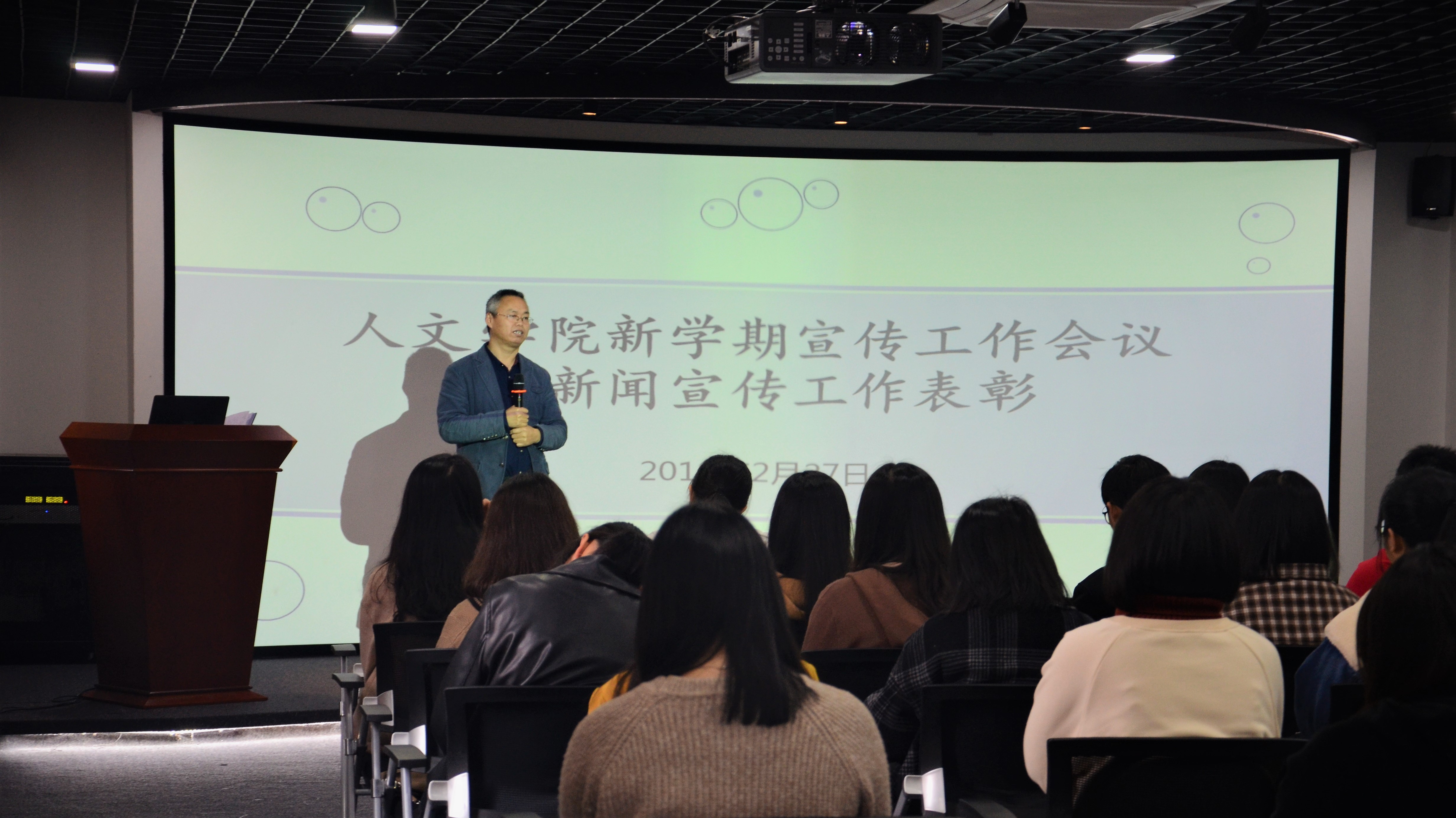 2月27日下午,beat365官方网站新学期宣传工作会议暨新闻宣传工作表彰大会在普照楼虚拟仿真实验室召开。beat365官方网站党总支书记兼副院长胡友仁、副书记刘巧玫、全院各班级宣传委员、团委、学生会宣传部门以及新媒体团队成员受邀参加本次大会。