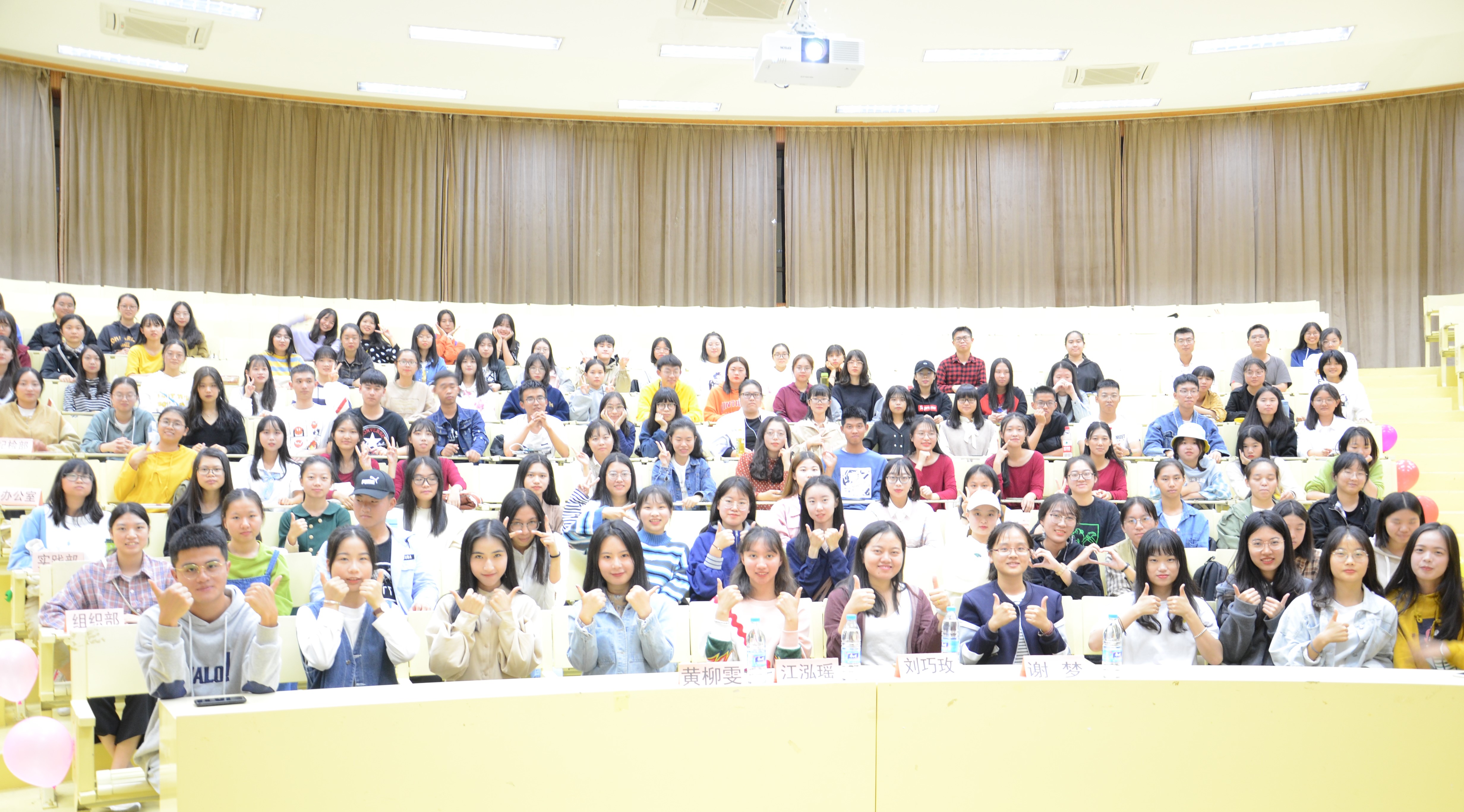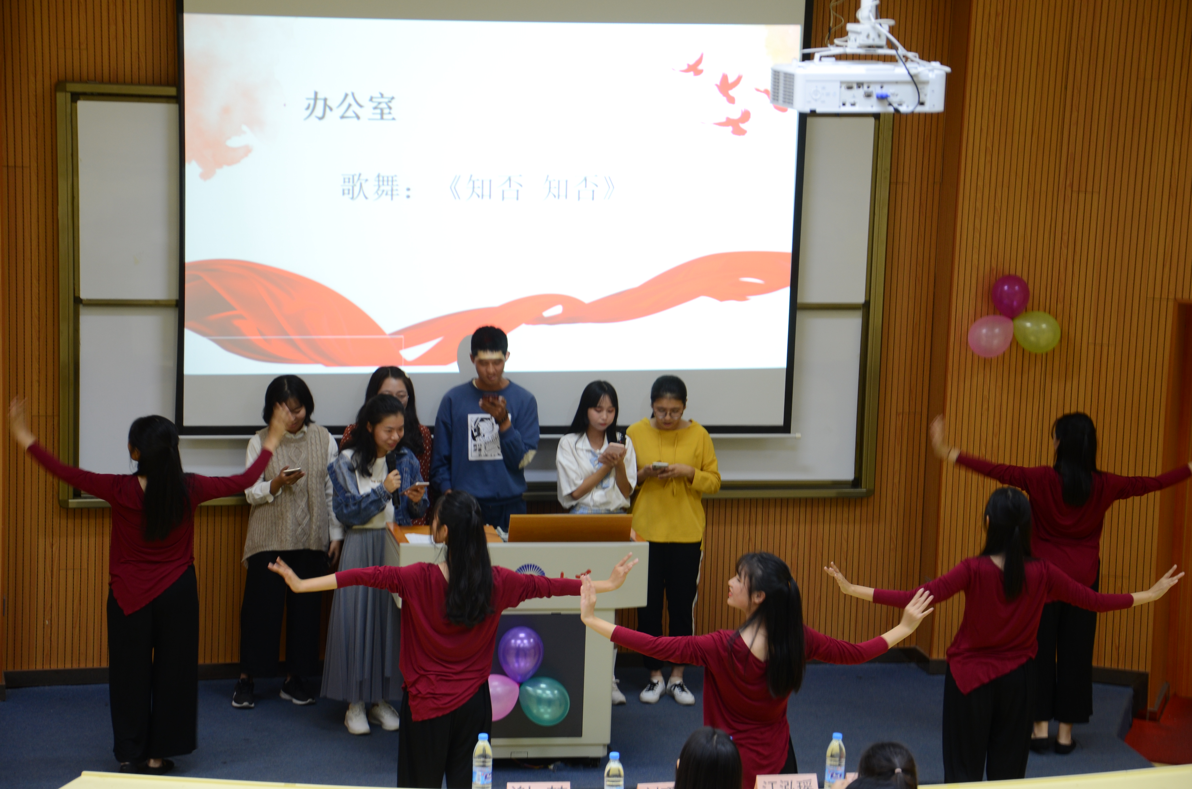 “夸张的肢体动作,妙趣横生的描述性语言,”期间穿插的“你说我猜”游戏环节更是激起全场的阵阵雷动的笑声和掌声,刘巧玫老师也和学生组队参与其中。游戏结束之余,组织部以一首舒缓绵长的吉他弹唱《奇妙能力歌》扣动心弦,拉进新老成员间的距离。紧随其后的办公室,以热门古风单曲《知否 知否》串联起一段柔美舞蹈,现场掌声不断。最后,纪检部成员独唱一曲《勾指起誓》,以稳健的台风和稳定的音准打破次元壁,全场不禁跟随节奏为她“打call”。