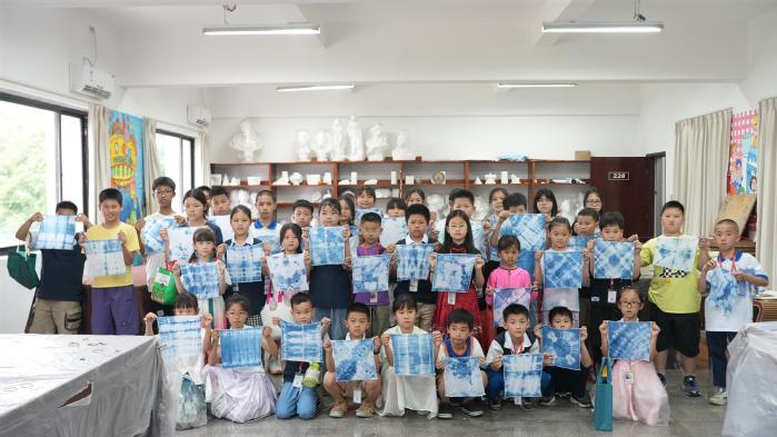此外,活动现场设有非遗扎染“海湾蓝”扎染体验区,由解说员带领小朋友们亲手体验扎染技艺。在解说员的指导下,小朋友们将布料折叠、捆绑,再浸入染料中,等待片刻后,一幅幅色彩斑斓、图案各异的扎染作品便呈现在眼前。通过亲手制作,他们不仅体验了有趣的过程,更是增进了对传统文化的了解与认识。