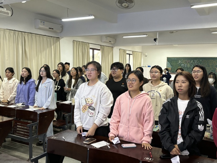 活动伊始,同学们陆续签到,随机抽取带有趣味问题的“时光卡片”和职业身份卡并组成小组有序入座。主持人以世界大学生日为契机,介绍活动背景,提出“大学生”“青春”“担当”等关键词引出活动目的。紧接着,主持人通过抽取任意号数的方式活跃气氛,邀请同学们分享对手中“时光卡片“问题的答案。随即正式进入活动,通过紧张激动的“击鼓传花”小游戏,同学们为自己的大学生活配一首歌或一句诗,奏响青春华章。各组讨论抽取到的职业身份卡,接力写下大学阶段规划,共有三组同学起身分享他们的青春蓝图。随后,主持人播放《未来,在我们手中》短片,同学们用纸折出纸船,写下对过去的遗憾和对未来的希冀。活动尾声,全体同学起立,齐声念下青年誓言,抒发挥斥方遒的少年意气。