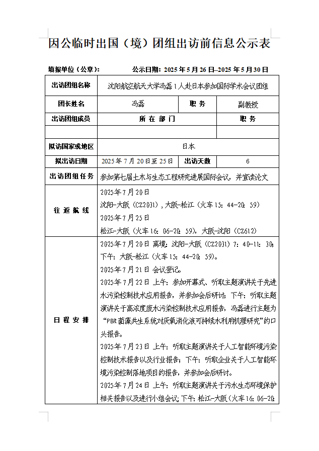 应第七届土木与生态工程研究进展国际会议的邀请,澳门网投拟派冯磊同志于2025年7月20日至7月25日赴日本参加第七届土木与生态工程研究进展国际会议。现就此计划予以公示。公示日期:2024年5月26日-5月30日。如有异议,可在公示期内与澳门网投唯一官网联系,电话:024-89724878,邮箱:foreignaffairs@sau.edu.cn。