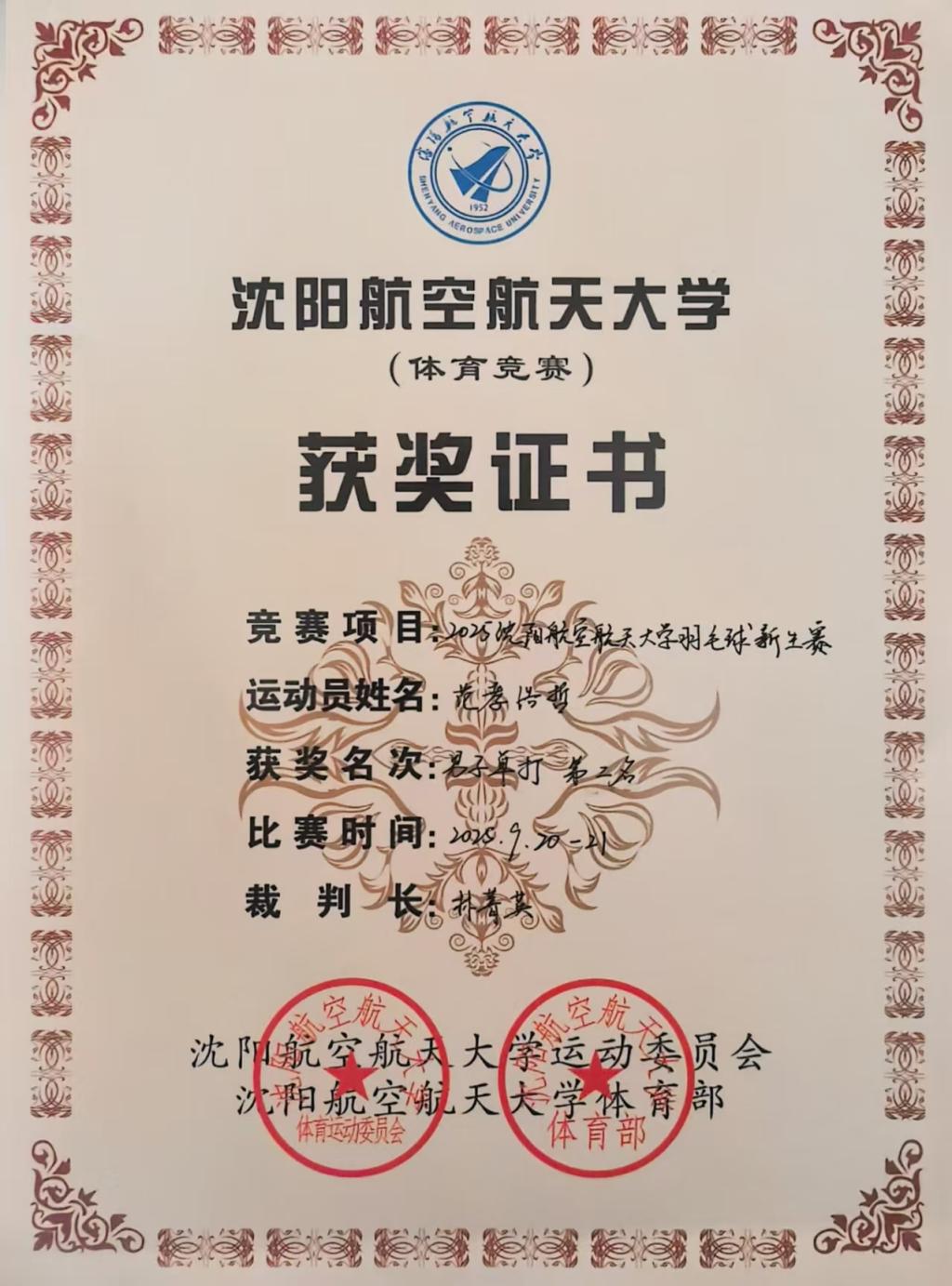 在羽毛球比赛中,我院男子单人比赛项目也取得了佳绩,飞制 2512 范孝浩哲获亚军、自动化 2511 杜帅锟获8强佳绩、飞动 2513 杨天石获16 强佳绩。